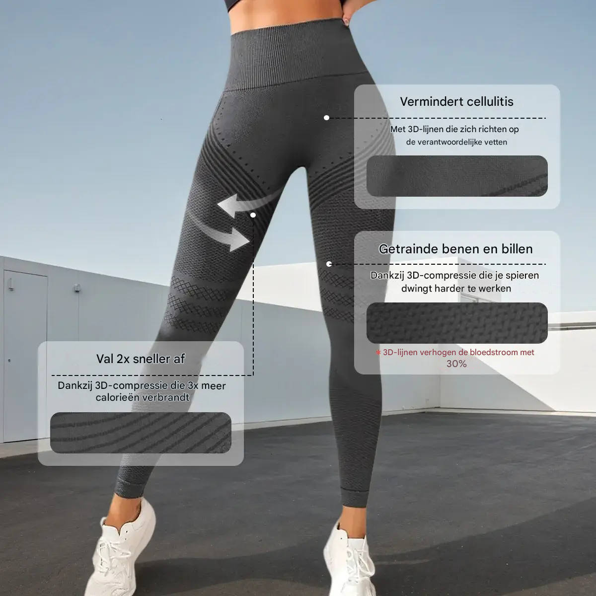 De 3D-compressietechnologie zorgt voor natuurlijke weerstand en activeert je spieren bij elke beweging. Deze stimulatie ondersteunt sterkere benen en helpt de zichtbaarheid van cellulite te verminderen door de doorbloeding te verbeteren.